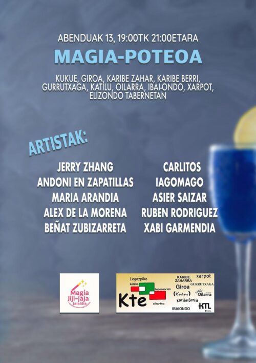 Kate tabernariei esker, berriz, “magia poteoa” prestatu dute, Kukue, Giroa, Karibe Zahar, Karibe Berri, Gurrutxaga, Katilu, Oilarra, Ibaiondo, Xarpot eta Elizondo tabernetan egiteko. Hamar magok parte hartuko dute poteo berezi honetan, “taberna bakoitzean bat izango da. Bi datoz kanpotik, oso onak biak, Carlitos Bartzelonatik eta Jerry Zhang txinatarra Madriletik. Besteak dira Andoni en Zapatillas, Maria Arandia, Alex de la Morena, Beñat Zubizarreta, Iagomago, Asier Saizar, Ruben Rodriguez eta Xabi Garmendia”. Larunbat arratsalderako plana izango da.