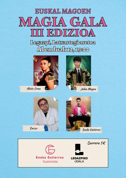 Udalarekin batera antolatutako Euskal Magoen 3. Galak irekiko du Legazpiko lehen magia jaialdia, eta egitarauko “ekitaldirik garrantzitsuena” izango da. Ostiral iluntzean izango da, Latxartegi aretoan, eta aurreko bi galak bezain arrakastatsua izatea espero du Gutierrezek. “Ni aurkezle lanetan arituko naiz berriz ere, eta aurten Markinako Oier Jurado ‘Enzzo’, Azpeitiko Julen Magoa eta Gasteizko Alaitz Oraa izango dira gonbidatutako magoak”.