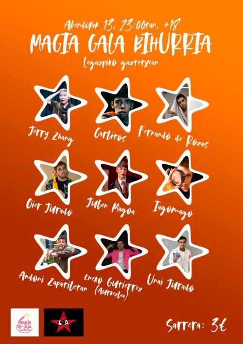 Larunbat gauean Gaztetxean izango da hitzordua, “magia gala bihurri batekin”. Helduentzako magia saio bat izango da, “publiko guztientzako magia galak egin ondoren, magook gauean taberna batean elkartuta egin ohi izan ditugunen antzekoa”. Honako hauek osatuko dute kartelera: Eneko Gutierrez berak aurkezle gisa, eta Carlitos, Fernando de Rozas, Oier Jurado, Julen Magoa, Iagomago, Andoni Zapatiletan eta Unia Jurado magoak-