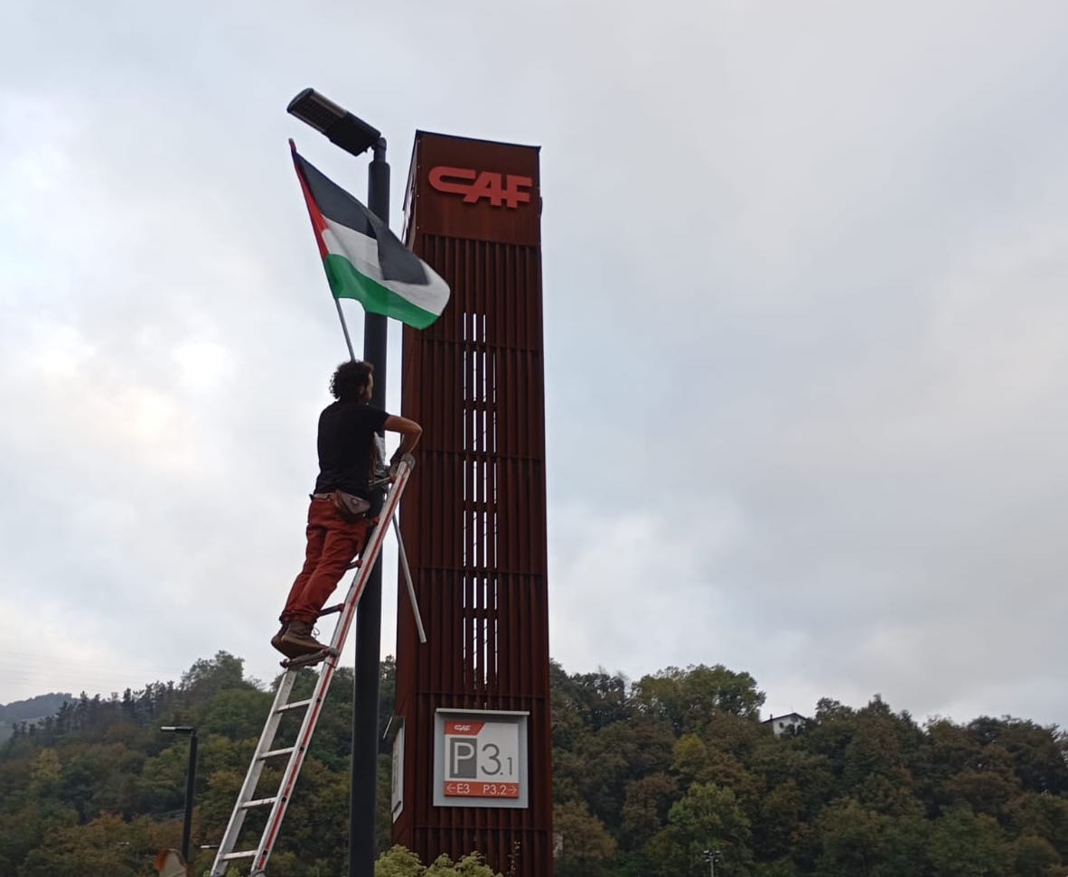 LABeko kideak Palestinako banderak jartzen.CAF-LAB Urriaren 15eko Palestinaren aldeko Lanuzte Orokorraren harira, Beasaingo CAFeko LAB sindikatuko ordezkariek salatu dute goizeko lehen orduan Ertzaintzak bost delegatu identifikatu dituela enpresaren inguruan Palestinako banderak jartzen ari zirenean. Sindikatuaren arabera, “tentsio uneak eta atxilotze mehatxuak” izan dira gertakarian zehar.