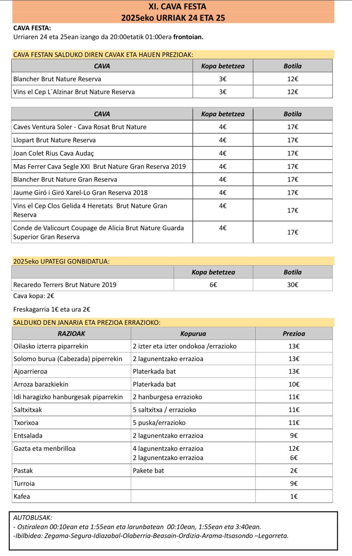Gipuzkoako Foru Aldundiak autobus zerbitzu bereziak ere jarri ditu Cava Festaren harira. Ostiralean 00:10ean eta 01:55ean irtengo dira autobusak Zegamatik eta Segura, Idiazabal, Olaberria, Beasain, Ordizia, Arama, Itsasondo eta Legorretan egingo ditu geldialdiak. Larunbatean ohiko gaueko ordutegian izango da autobus zerbitzua.