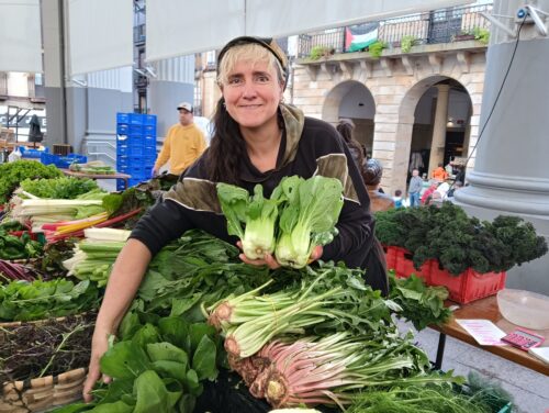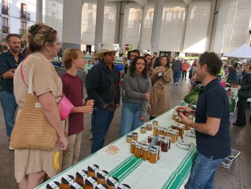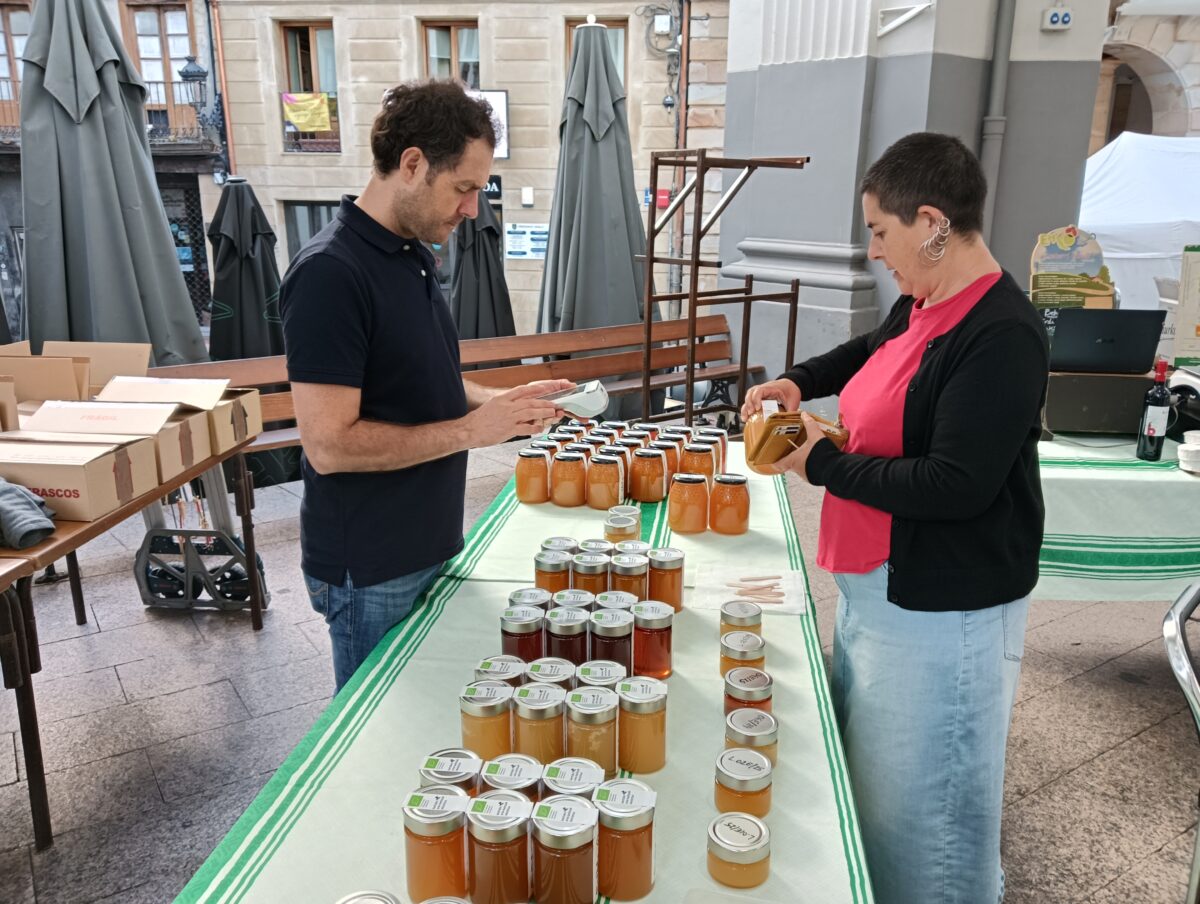 Etxeberriaren postuan jende asko ibili da gaur, erostera hurbildutakoekin batera, eztia probatzera joandakoak ere izan dituelako inguruan. Horietako batzuk Basque Culinary Centerretik D’Elikatuz zentroko gidariekin azoka bisitatzera joandakoak ziren, atzerritarrak gehienak.