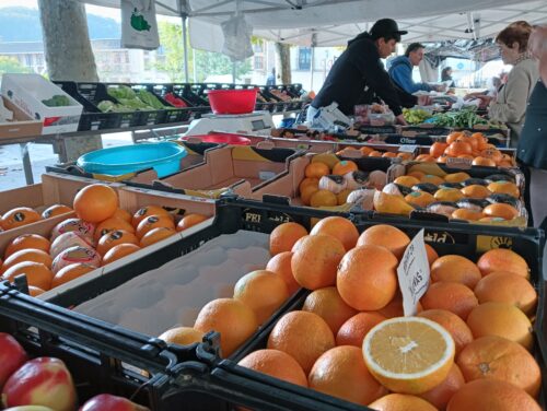 Zuhaiztiko fruta saltzaileen postuetan, azkenik, zitrikoak izan dira gaur albiste, Valentziako laranja berriak iritsi direlako azkenik. Kiloa 2,25 eta 2,95 euro artean dago.