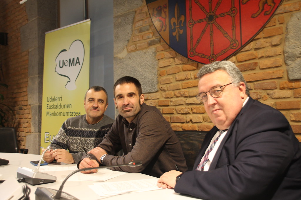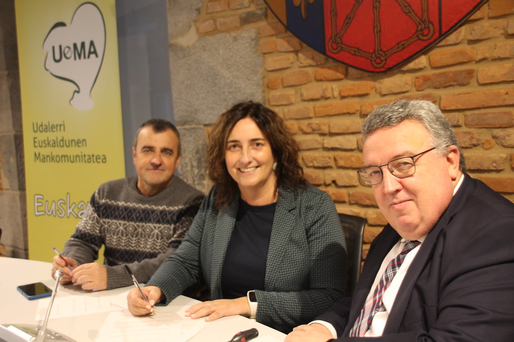 Ioritz Berra Zaldibiako alkatea hitzarmena sinatzen, Aramendi eta Aranburu ondoan dituela.UEMA