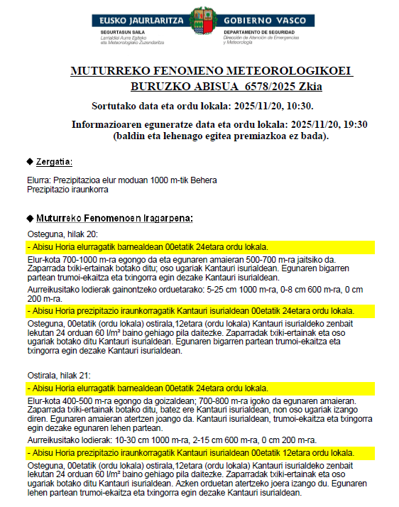 Zerua oso hodeitsu edo estalita egongo da. Zaparrada txiki-ertainak botako ditu; zenbait tokitan ugariak izango dira. Trumoi-ekaitza eta txingorra bota dezake. Elur-kota 800-1000 metrora egongo da goizaldean, 600-900 metrora jaitsiko da eguerdian eta 500-700 metrora gauean, noizbehinka beherago. Ipar-osagaiko haize ahul-bizia ibiliko da, bolada gogorrekin. Tenperatura nabarmen edo asko jaitsiko da.