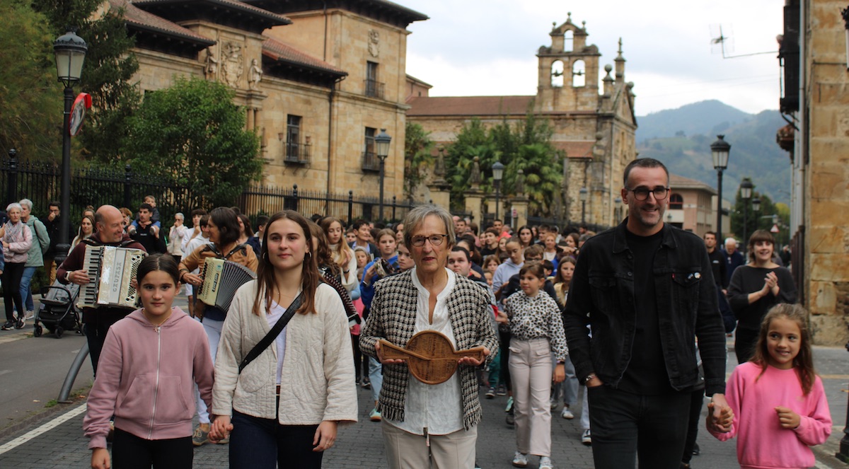 Mari Karmen Eizagirre eta haren sendia, lekukoa esku artean. Izaro Villarreal Lazkaoko Ikastolak 50. Kilometroak jaiaren aurkezpen ekitaldia egingo du bihar plazan. Urteurren berezia izango da, bost hamarkada geroago lehen aldiz festa hori ospatu zen herrira itzuliko baita. Datozen hilabeteetarako dituen asmo eta helburuen berri emango du, eta aukeratutako leloa eta logoa ere ezagutaraziko ditu. Ekitaldia 18:30ean hasiko da, eta aurrez bideo bat proiektatuko dute.