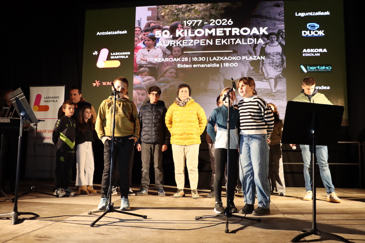 Lazkako Ikastolako hainbat ikasle bertsotan, Amaia Agirre, Aratz Igartzabal eta Mikel Etxezarreta bertsolariak lagun zituztela, atzo.Iñaki Gurrutxaga Orain 48 urte, 1977an, Lazkao eta Beasain artean egin zen I. Kilometroak jaia gogora ekartzeko bideo labur baten proiekzioak eman zion hasiera atzo 50. Kilometroak jaiaren aurkezpen ekitaldiari. Juan Joxe Agirre artxibozain beneditarrak, Luis Mari Aldanondo Lazkako Ikastolako zuzendari izanak, Karmele Auzmendi eta Kari Eztala andereño ohiek eta Ainhoa Gurrutxaga ikasle ohiak ordukoa nola bizi izaten zuten kontatu zuten. Hurrengo urteko edizioaren helburuak zeintzuk izan beharko luketen ere aipatu zuten.