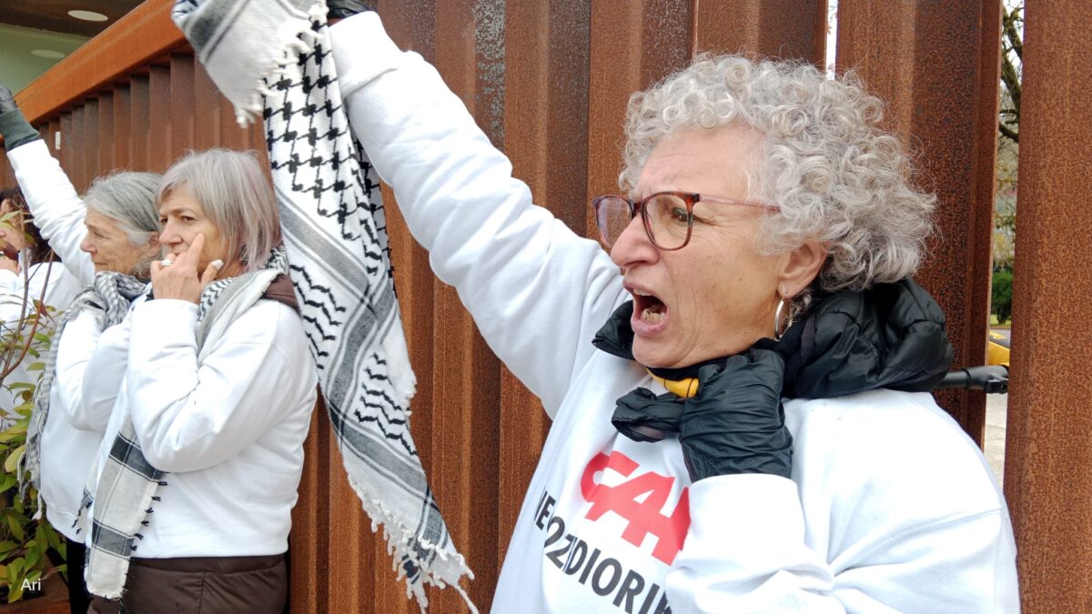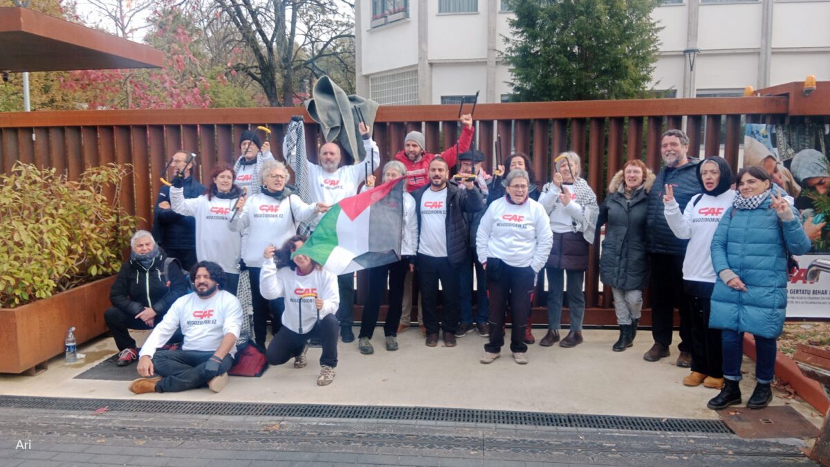 Gazaren aldeko ekintzaileak, protesta bukatu berritan.Ariane Vierbücher Gazarako Mugimendu Globala taldeko hamar kide CAFeko sarrera nagusiaren hesira kateatu dira gaur goizean, 08:00etan. Israel hiltzaile, CAF laguntzaile izan da gehien errepikatu duten aldarria. Inguruan beste hogei lagun inguruko taldea izan dute babesa ematen.