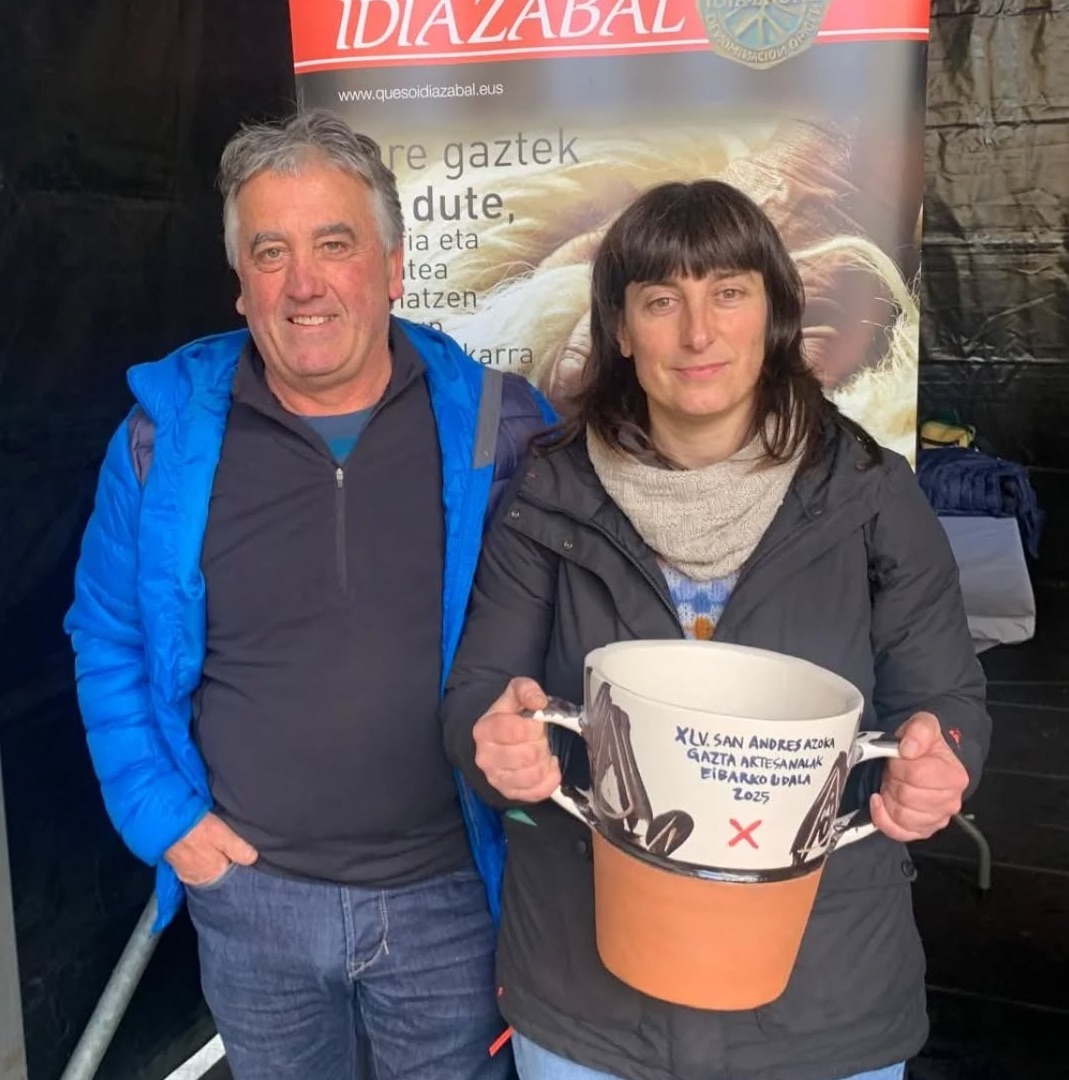 Aizpeako Mikel Etxezarreta eta Legutioko Iruri Gaztako Maider Martinez. Idiazabal Gazta Eibarko 45. San Andres Azoka ospatu zuten atzo, eta horren barruan Gazta lehiaketa ere izan zen. Bigarren saria lortu zuen Mikel Etxezarretaren eta Eli Arrillagaren Olaberriko Aizpea Gaztak. Etxezarretan jaso zuen saria. Txapelketa Legutioko (Araba) Iruri gaztak irabazi zuen.