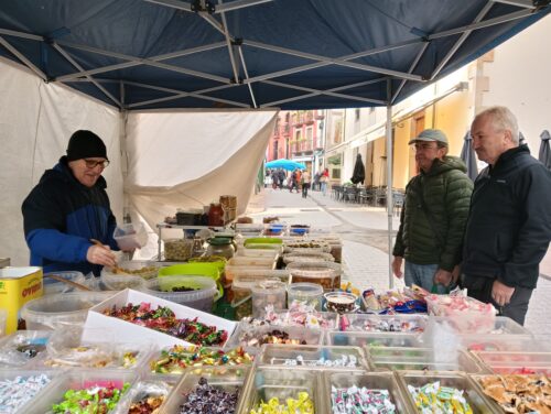 Gaur ere izan da kanpoko jendea feria bisitatzen. D’elikatuz zentroko arduradunen eskutik, Basque Culinary Centerreko ikasle talde bat, eta Bizkaiko Barakaldoko Lanbide Heziketa Zentroko beste talde bat, 27 lagunekoa, ibili dira Plaza Nagusian postuz postu.