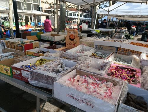 Gozo eta fruta kontuak ere moldatu dira Gabonetarako, eta hasita daude polboroiak, mazapanak, pikuak eta beste. Horrelako gaiak lau postutan erosi daitezke ferian: Rufina Ramajo, Juan Jose Gastesi eta bien alaba Ainararena Plaza Nagusiaren albo batean dago, Teo Muñozena beste alboan, eta Luis Rodriguezena goi aldean; Zuhaiztian, berriz, Jon Blancok du postua. Hauek dira salgai dituzten Gabonetako produktu esanguratsuenak: polboroiak (11,9-38,5 €), mazapanak (16,9-26€), mantekatuak (18€), girlatxea (20-26€), mahats pasak (6,9-22€), aran pasak (10-12€), orejoiak (16,5-22€) eta pikuak (7,5-18€).