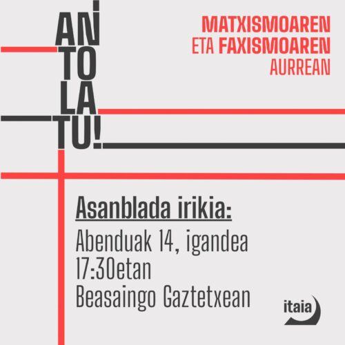 Goierriko Itaiak datorren abenduaren 14an, arratsaldeko 17:30ean, Beasaingo Gaztetxean egingo den asanblada irekira deitu du. Helburua, euren hitzetan, “amorrua antolatzea eta matxismoaren eta faxismoaren aurrean lehen lerroan egotea” da.