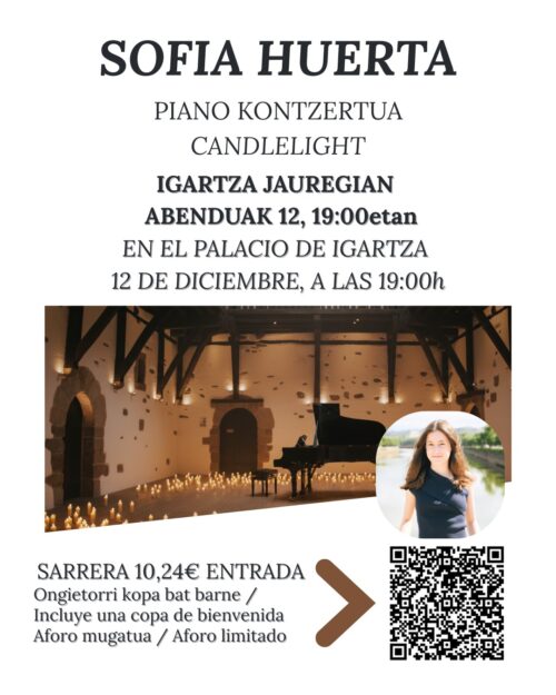 Beasaingo Igartzako jauregiko giro historiko eta magikoan, argiztapen txikiz apainduta, Sofia Huerta Castrillo piano-jotzaile gazteak kontzertu berezia eskainiko du abenduaren 12an, 19:00etan. Sarrerak 10,24 euroan daude eskuragarri, eta edari bat barne dago. Aforoa mugatua izango da.