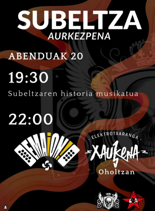 Subeltza musika kolektiboak aro berria hasi du, eta larunbatean, abenduak 20, ekitaldi bat egingo du Gaztetxean esku artean dituzten proiektuak aurkezteko. Musikaz lagunduta, 19:30ean Subeltza berriko kideak oholtzara igoko dira, 1998an hasi zen historiari errepasoa emateko, gaurko taldeak aurkezteko eta etorkizunerako asmoak azaltzeko. Gauean, 22:00etan hasita, bi talde izango dira taulatura igoko direnak, Emaion, eta lehen aldiz kalejira formatutik aldenduta, Xaukena elektrotxaranga. Goizaldera arte luzatuko den festa agindu dute.