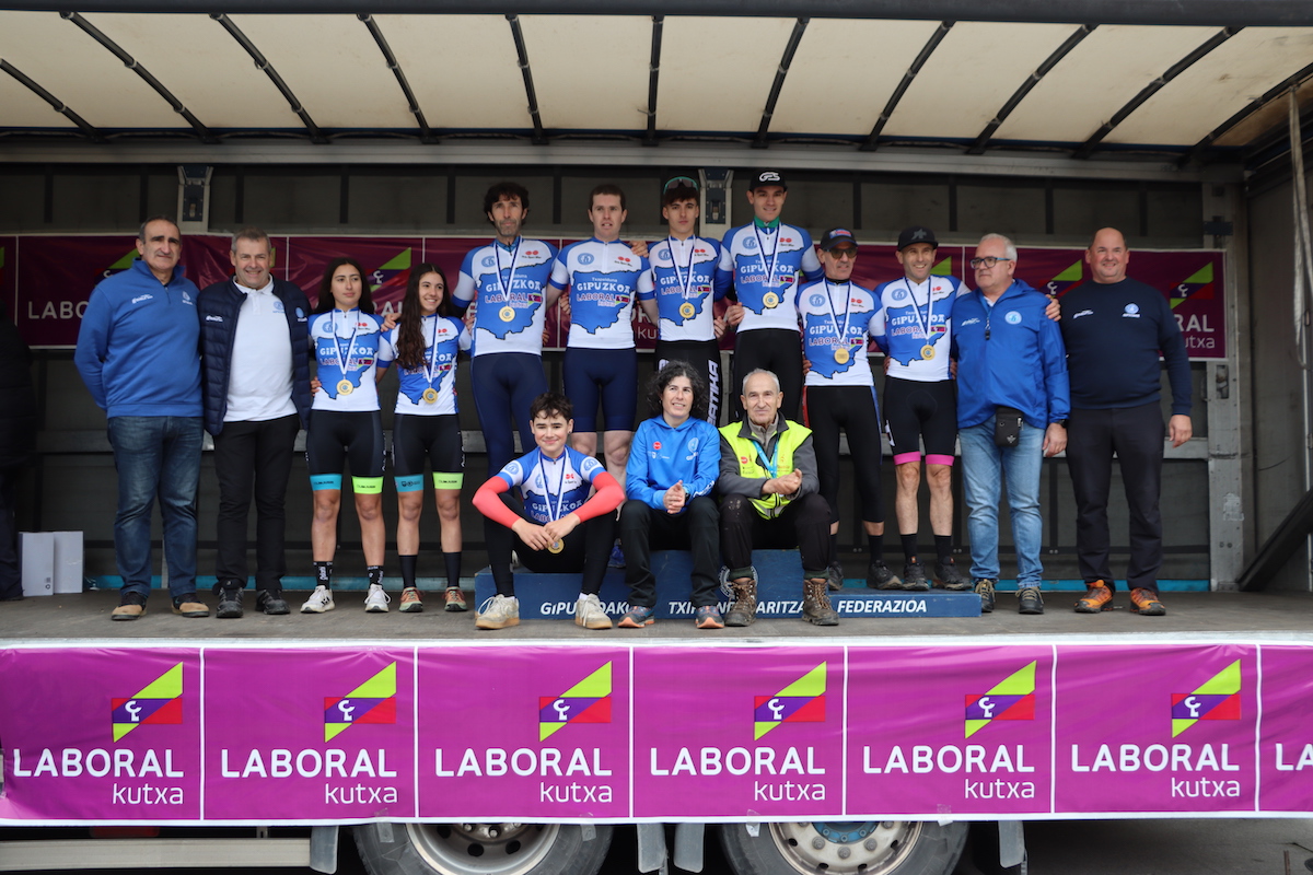 Gipuzkoako ziklo-kros txapeldun guztiak, Ataungo probaren antolatzaile, babesle eta agintariekin.Iñaki Gurrutxaga