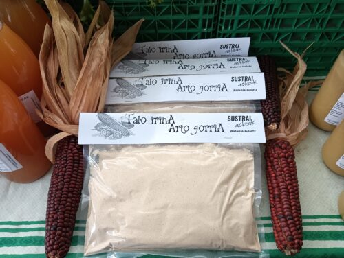 Arto irina ere berria izan da postu honetan, etxean ekoitzitakoarto gorriaren irina, Aramako Ibares errotan ehotakoa. Kilo erdiko paketeak zituen salgai, 6 euroan. Pakete bakoitzarekin 8-10 talo egin daitezkeela esan du.