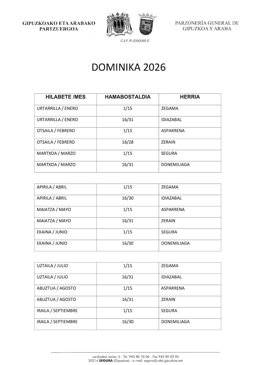 Oltzeko bazkalekuko Dominika txabola su egurrez hornitzeko auzolana, artxiboko irudian.Hitza Gipuzkoako eta Arabako Partzuergoak Dominika txabola erabiltzeko egutegi berria jakinarazi du. Gipuzkoako eta Arabako Partzuergoa sei udalerrik osatzen dute, Goierriko lauk eta Arabako bik: Idiazabal, Segura, Zegama eta Zerain; eta Asparrena eta Donemiliaga. Herri bakoitzak hamabost eguneko epean erabil dezake, urtean lau alditan, 2012tik. Egutegiaren arabera, urtarrileko lehenengo hamabostaldia Zegamari egokitu zaio eta bigarrena, Idiazabali.