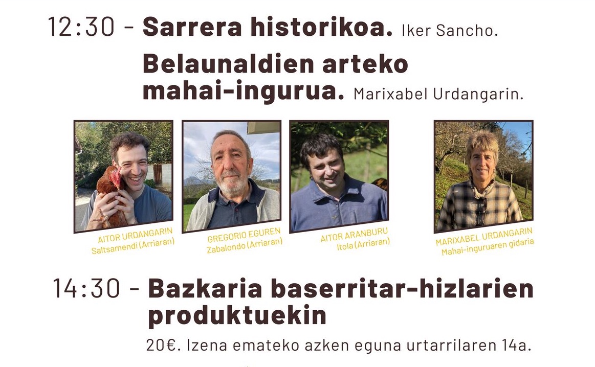 12:00etan hasiko da. Iker Sanchok sarrera historikoa aurkeztuko die bertaratzen direnei. Ondoren, belaunaldien arteko mahai ingurua izango da. Marixabel Urdangarinek gidatuko du mahai inguru hori, eta Aitor Urdangarin (Saltsamendi, Arriaran), Gregorio Eguren (Zabalondo, Arriaran) eta Aitor Aranburu (Anbu, Olaberria) izango dira hizlariak. 14:30ean, berriz, bazkaria egingo dute baserritar-hizlarien produktuekin. Bazkarirako izena eman behar da; urtarrilaren 14a da azken eguna horretarako. Prezioa 20 eurokoa da