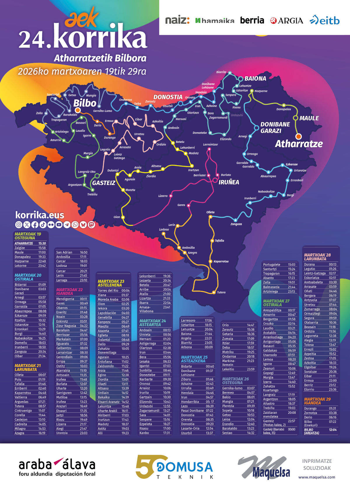 Deskargatik gora egunsentian sartuko da Urretxura eta Legorretatik irtengo da 13:00ak aldera. 3.436 lekuko-hartze izango dira eta 2.175 kilometro izango ditu ibilbideak.