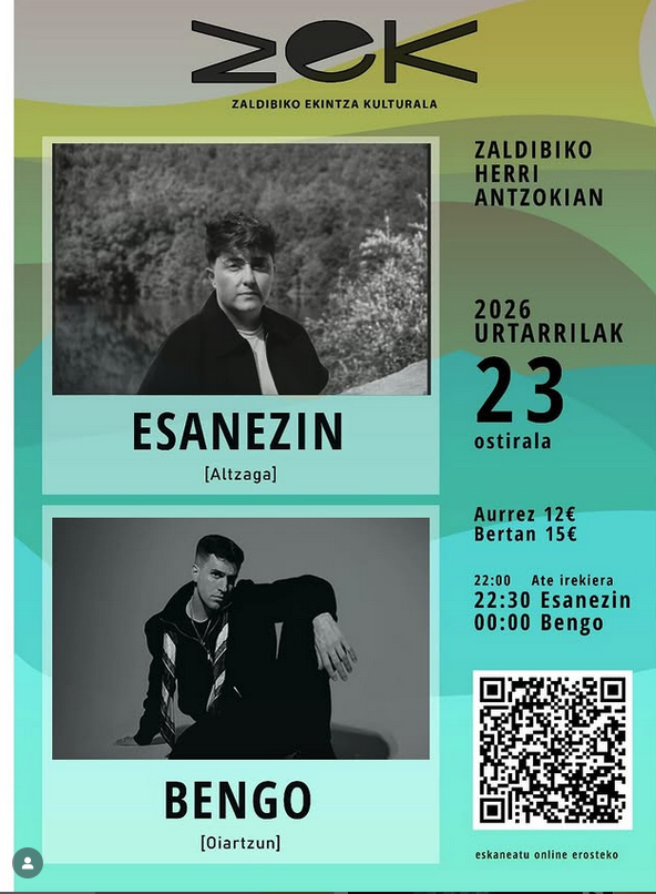 ZEK Zaldibiako Ekintza Kulturalak dagoeneko itxita du hurrengo hitzordu berezia. Oraingoan, beste bi musikari gonbidatu dituzte herriko antzokira, urtarrilaren 23an: Bengo eta Esanezin. Ate irekiera 22:00etan izango da eta Esanezinen txanda izango da aurrena. Sarrerak salgai daude kultur etxean, 12 euroan.