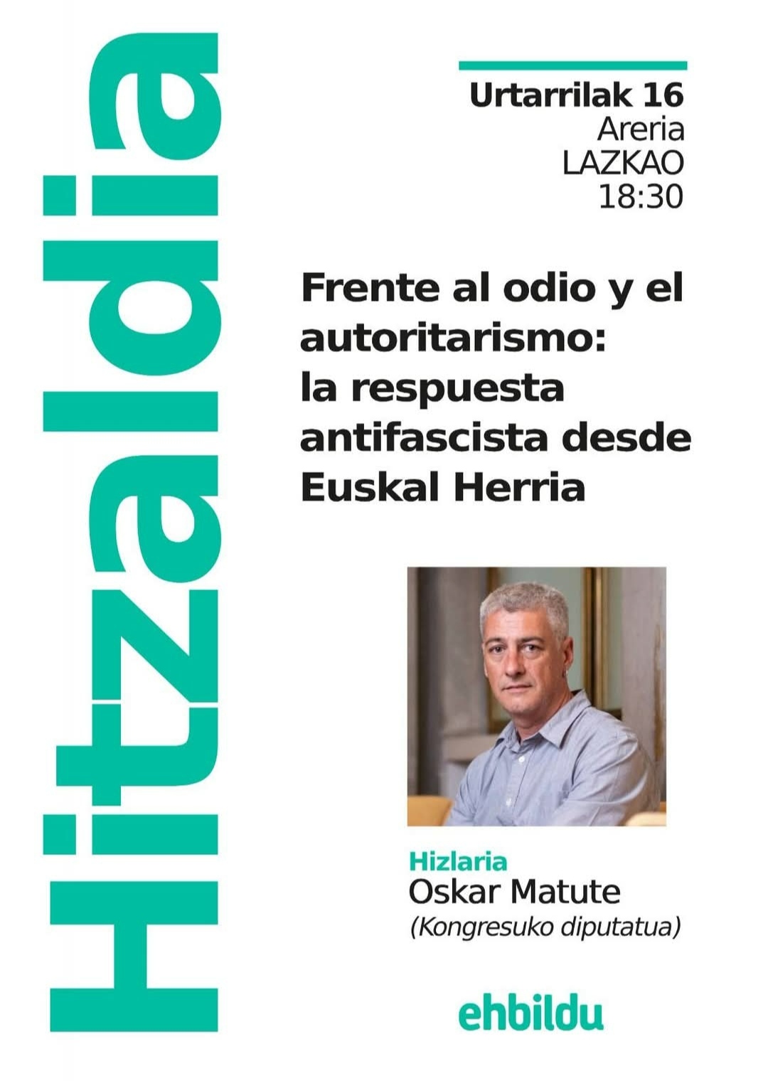 Oskar Matute EH Bilduren Espainiako Kongresuko diputatuak solasaldia egingo du ostiralean, 18:30ean, Lazkaoko Areria aretoan. Autoritarismoaren zein antifaxismoaren gaia izango ditu hizpide, Gorrotoaren eta autoritarismoaren aurrean: erantzun antifaxista Euskal Herritik lelopean egingo duen hitzartzean. Lazkaoko EH Bilduk antolatutako ekimena da.