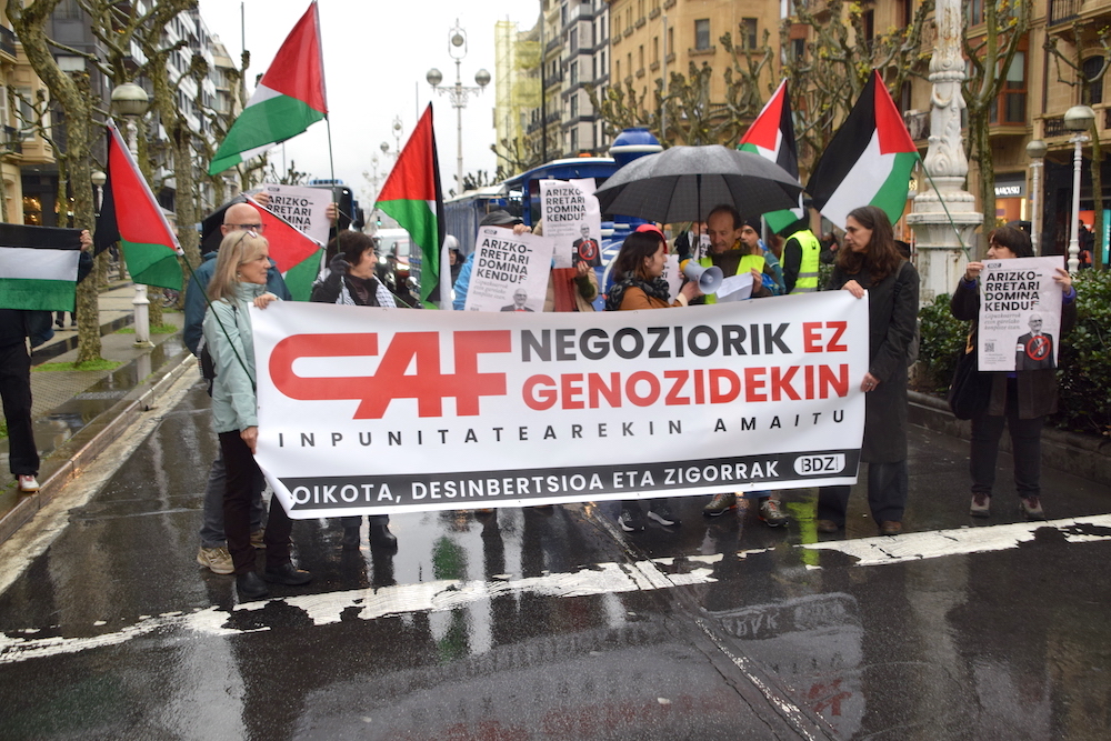 Andres Arizkorreta buru duen CAF enpresa gipuzkoarrak Israelekin "konplizitatea" duela salatu du BDZk, txu-txu trenean egindako ekintza baten bidez. Urrezko Domina kentzeko sinadura bilketa abiatu dute, baita otsailaren 7rako manifestaziora deitu ere.