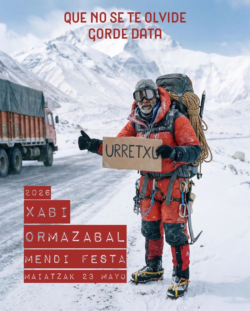 Xabi Ormazabal mendi festak baditu kartela eta data dagoeneko. Festa maiatzaren 23an izango da eta, beti bezala, mendizaletasunarekin lotutako hamaika ekitaldi izango dira eta punta-puntako alpinista eta eskalatzaileek parte hartuko dute. Egun horretan Urretxu mendizaleen topagunea izango da eta horixe islatu dute kartelean: alpinista bat auto-stop egiten, Urretxura bidean.