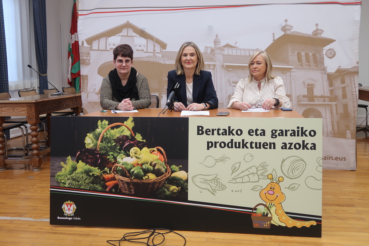 Ezker-eskuin: Elena Ruiz merkataritza zinegotzi delegatua, Leire Artola alkatea eta Ane Egurtza merkataritza teknikaria, plaza azpian, ekimenaren aurkezpenean.Laida Goiburu Beasaingo astearteroko azoka ofizializatu zenetik ehun urte bete dira, eta udalak mendeurrena ospatzeko ekintza bereziak antolatu ditu datorren asterako. Otsailaren 2an azokaren bilakaeraren eta erronken inguruko mahai-ingurua izango da, eta otsailaren 3an, astearteroko azoka apartekoa izango da. Udaletxean prentsaurrekoa egin dute Leire Artola alkateak, Ane Egurtza udaleko merkataritza teknikariak eta Elena Ruiz Herritar saileko Merkataritza azpisaileko zinegotzi delegatuak mendeurreneko ospakizunen berri emateko.