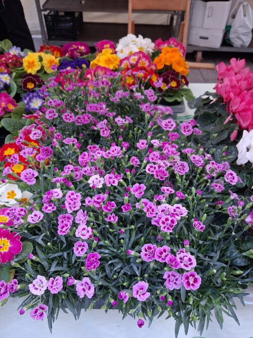 Dagoeneko baditu urtaro horri begirako hainbat lora salgai, udaberriko lorea, hiazintoa edo nartzisoa bezala, eta gaurtik, baita krabelina ere. Lore txikiko landareak ditu momentuz, arrosa kolorekoak, eta bakoitza 5,5 euroan du.