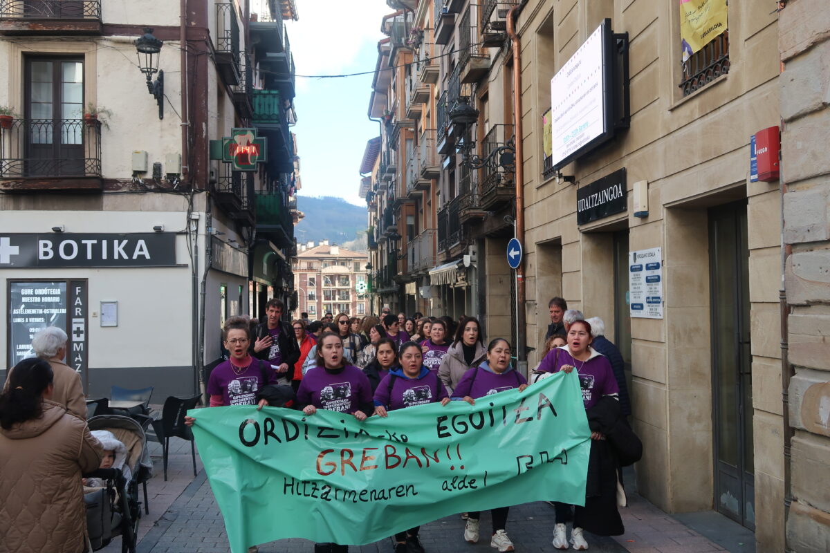 Olano parean egin dute hitzordua, eta bertatik abiatu dira hamarnaka emakume. Ordiziako plaza nagusian amaitu dute ibilbidea, eta Ana Mertxan Zabaletak hartu du hitza. Azaldu du patronalekin egoera “oso gaizki” dagoela: “Iaztik hona ez da aurrerapausorik eman, eta politikoki erakutsi duten inplikazioa ere eskasa izan da”.