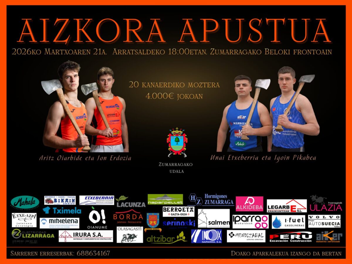 - Aizkolariak: Unai Etxeberria ‘Osinalde’ (Ezkio) eta Igoin Pikabea III.a (Erenotzu, Hernani) / Jon Erdozia eta Aritz Oiarbide (Etxarri-Aranatz).