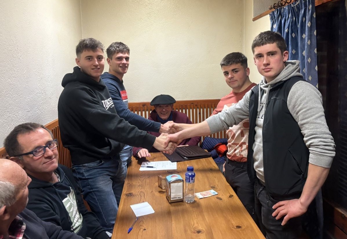 Unai Etxeberria 'Osinalde', Joxe Ugarteburu eta Igoin Pikabea, otsailaren 7an Ezkioko Pagoaga baserriaren atarian egindako argazkian.Gotzon Aranburu Hogei kanaerdiko zeinek lehenago ebaki. Horixe lau aizkolari gaztek urtarrilaren 2an Etzegarate gaineko (Idiazabal) Alai jatetxean adostutako jokoa, laurentzat aurrenekoa. Unai Etxeberria Osinalde (Ezkio, 2006) eta Igoin Pikabea hernaniarra (Pikabea III.a) ariko dira batetik, eta Etxarri Aranazko Jon Erdozia eta Aritz Oiarbide lehengusuak bestetik. Apustua martxoaren 21ean izango da Zumarragako Beloki pilotalekuan. 4.000 euro daude jokoan.