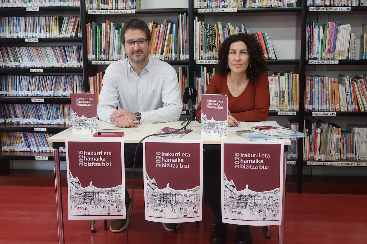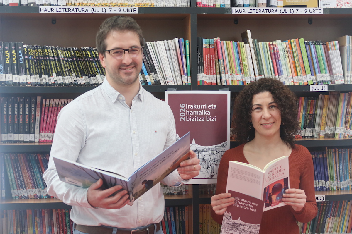 Adur Ugartemendia alkateordea eta Rebeka Piñeiro liburutegiko arduraduna, kanpainaren aurkezpenaren ondoren.Laida Goiburu Irakurzaletasuna sustatzeko 2026ko kanpaina aurkeztu du Beasaingo Udalak, Irakurri eta hamaika bizitza bizi leloarekin. Martxoan eta apirilean banatuta, hainbat ekintza antolatu ditu, haur, gazte, hezitzaile zein helduei zuzenduta. Udal liburutegian egin dute aurkezpena Adur Ugartemendia alkateordeak eta Rebeka Piñeiro liburutegiko arduradunak.