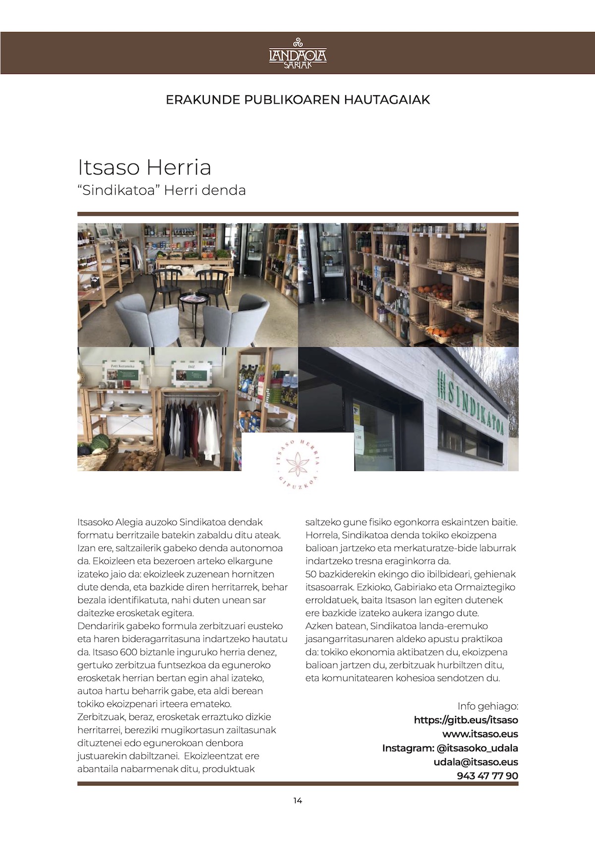 Itsaso Herriaren baitako Sindikatoa herri dendaren irudia. Josune Zarandona Gipuzkoako landa garapeneko proiektuei errekonozimendua egiteko antolatzen diren IX. Landaola sariketa hautagaiak ezagutzera eman ditu antolakuntzak. Hautagaien artean dira, Goierri Garaiko baserritarrek erabiltzen duten Oñatiko Zubillaga hiltegia, eta Zegamako Soraluze baserriaren Basoberri proiektua erakunde pribatuen atalean eta Itsaso Herriaren Sindikatoa herri dendaren proiektua erakunde publikoenean. Aipatutakoez gain, Emakumeak landa eremuan eta Urteetako ibilbidea sariak ere banatuko dituzte.