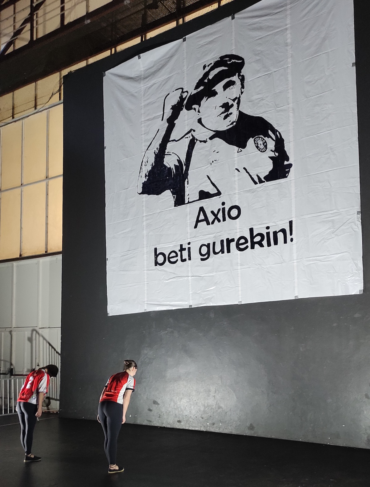 Iñaki Luloaga jokalari ohi zaldibiarrak eman dio hasiera ekitaldiari. 19:00ak badira, eta frontoiak bestelako itxura du dagoeneko. Haren hitzen ondotik, Axio, beti gurekin! zioen argazki erraldoia jaso dute frontoiaren erreboteko horman, eta Añes Aierbek eta Juna Sarriegik ohorezko agurra dantzatu diote. Lehen txalo zaparradak.