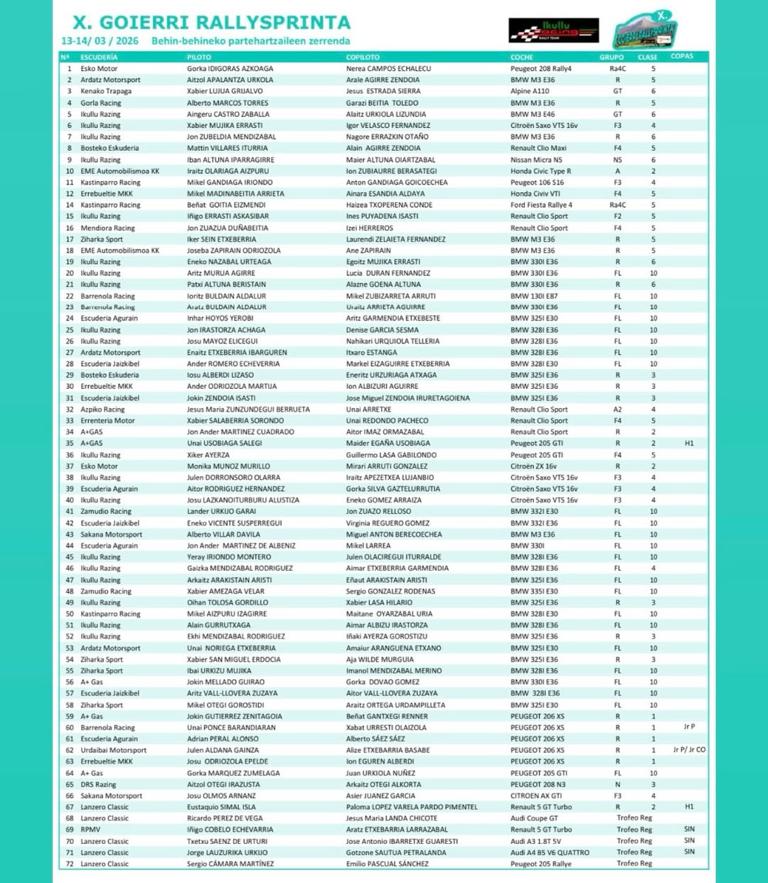 Bihar, autoen egiaztapenak egingo dituzte, 17:30ean. Rallyesprinta larunbatean izango da, eta 10:00etan hasiko da. Lasterketarekin lortzen duten dirua Lazkaoko Ikastolari emango diote Kilometroak antolatzen laguntzeko. Albistean, partaideen zerrenda; tartean hemezortzi goierritar.