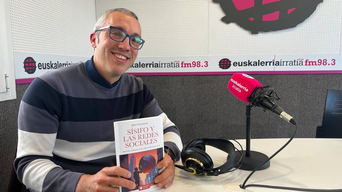 Julen Linazasoro, sare sozialei buruz idatzi duen liburua eskuan duela. Hitza Julen Linazasorok Sisifo y las redes sociales liburua aurkeztuko du astelehenean Beasaingo udal liburutegian, 17:30etik aurrera. Sisiforen mitoaren bitartez, sare sozialek eragiten duten adikzioaren eta egungo eredu teknologikoen inguruan hitz egiten du saiakera liburuan.