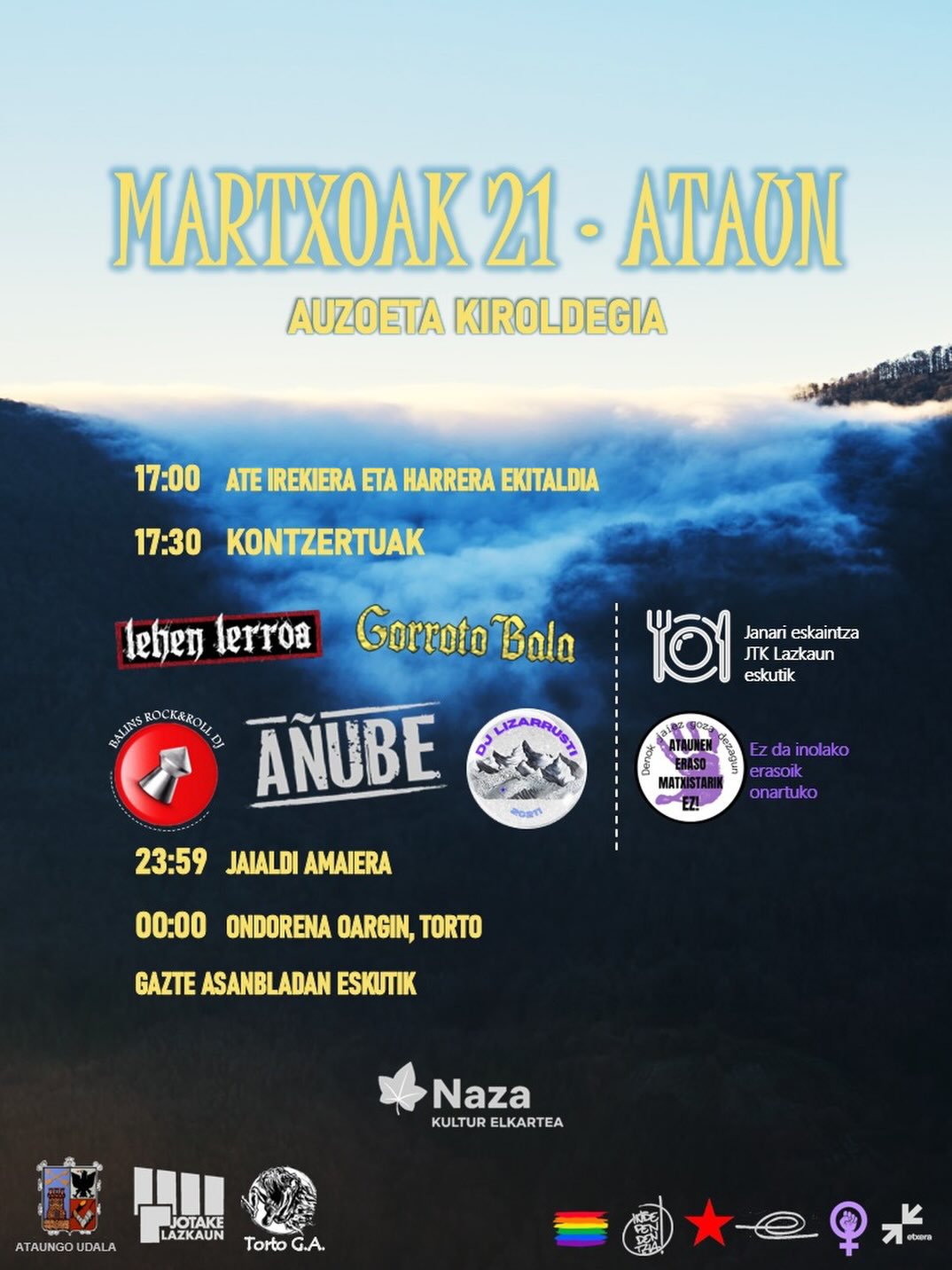 Ekitaldi batek emango dio hasiera jaialdiari, eta 17:30ean hasiko dira kontzertuak. Gorroto Bala, Lehen Lerroa eta Añube izango dira oholtzara igoko diren taldeak. Añuben Egoitz Goikoetxea ataundarrak jotzen du bateria, eta aurten Goierrin emango duten kontzertu bakarra izango da Ataungoa. Haiekin batera Ballins Rock&Roll DJa eta DJ Lizarrusti izango dira. JTK Lazkaun taldekoek jatekoa eskainiko dute.