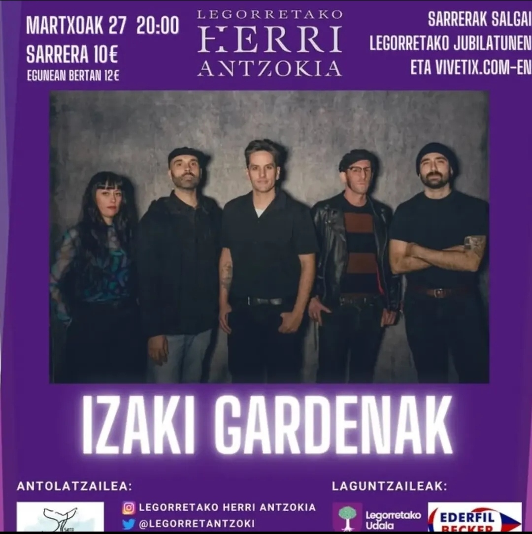 Izaki Gardenak Gasteizko taldea. Hitza Datorren ostiralean, hilak 27, Izaki Gardenak talde gasteiztarrak kontzertua egingo du Legorretako Herri Antzokian. Sarrerak aurrez eros daitezke Jubilatuen tabernan eta vivetix.com webgunean (10 euro), eta egunean bertan leihatilan salduko dituzte, 12 euroan.