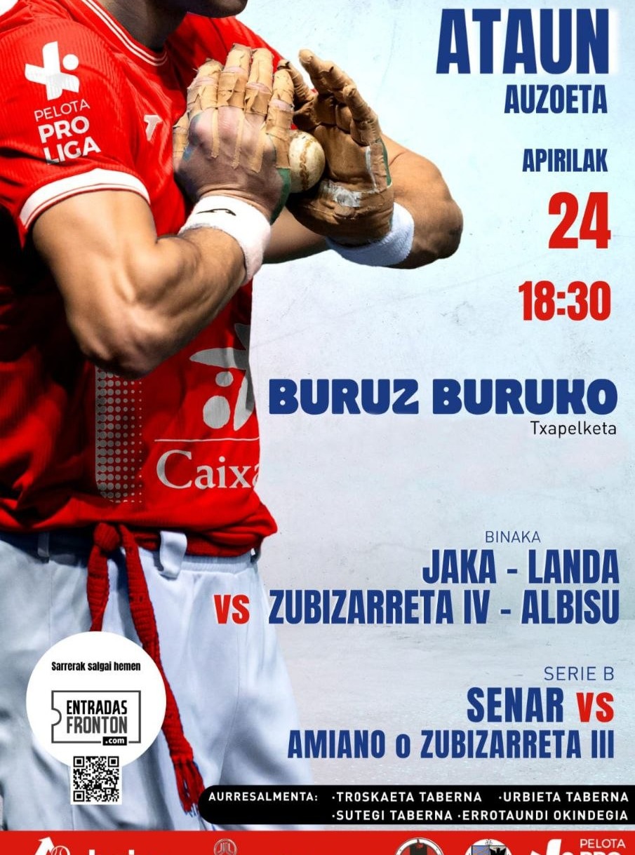 Hiru pilotari profesionalak batera partida berean lehen aldiz, iaz, Ataun KE-k antolatutako jaialdian, Auzoeta kiroldegian, iazko azaroaren 15ean. Ezker-eskuin: Jon Ander Albisu, Beñat Senar, epailea, Martxel Iztueta eta Iraitz Zubizarreta. Aimar Maiz Buruz Buruko Txapelketako eta binakako partida bana jokatuko da Ataungo Auzoeta kiroldegian, ostiralean, apirilaren 24an, 18:30ean. Beñat Senarrek Unai Amiano edo Iraitz Zubizarretaren aurka jokatuko du Buruz Buruko B serieko txapelketako partida. Binakako partidan, berriz, Erik Jakak eta Unax Landak, Beñat Zubizarreta eta Jon Ander Albisu bikote ataundarraren aurka neurtuko dituzte indarrak. Herriko zenbait lekutan sarrerak salgai egongo dira: Troskaeta tabernan, Urbieta tabernan, Sutegi tabernan eta Errotaundi okindegian.