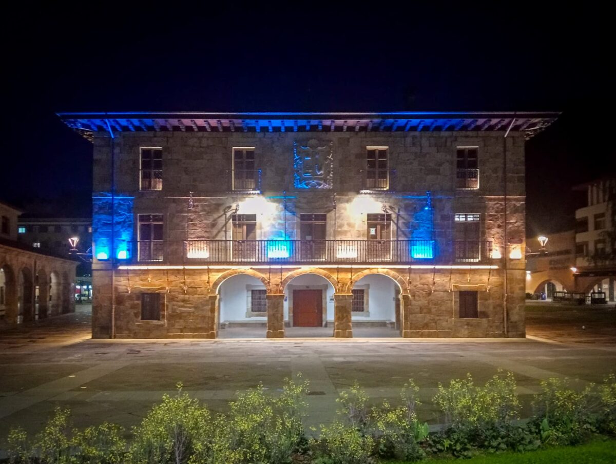 Udaletxea txuri-urdinez argiztatzen dute gauero, astelehenetik. Bihar, pantaila erraldoia jarriko du udalak Euskal Herria plazan, eta partida aurrekoa girotzeko, herriko hainbat musikarik kalejira egingo dute.