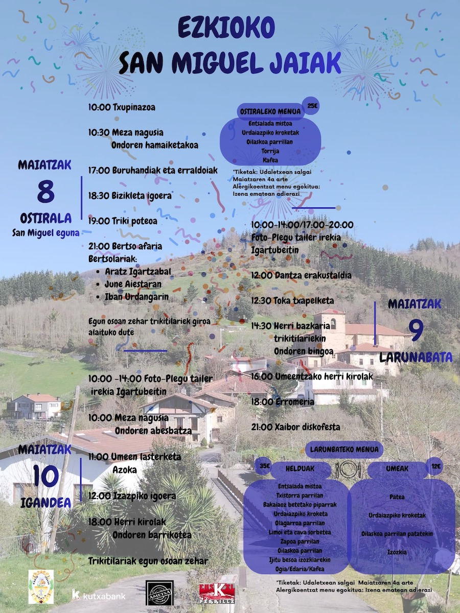 Ezkioko San Migel jaiak maiatzaren 8tik 10era ospatuko dituzte aurten. San Migel egunarekin hasiko dituzte jaiak, maiatzaren 8an, 10:00etan botako duten txupinazoarekin. Nabarmentzekoen artean, Bizikleta igoera izango da 18:30ean eta bertso afaria iluntzean (21:00). Aratz Igartzabal, June Aiestaran eta Iban Urdangarin arituko dira aurten bertsotan.