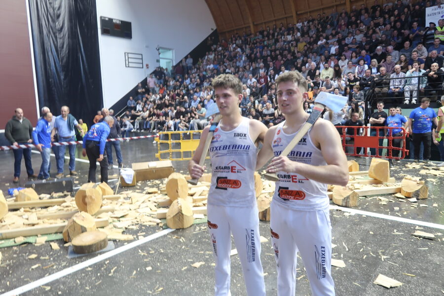 Jon Erdozia eta Aritz Oiarbide etxarriarrek Unai Etxeberria Osinalde ezkiotarrak eta Igoin Pikabea ereñotzuarrak baino lehenago bukatu dute aizkora lana. Elkarri botatako desafioan 4.000 euro zituzten jokoan. Zumarragako Beloki pilotalekua lepo bete da.
