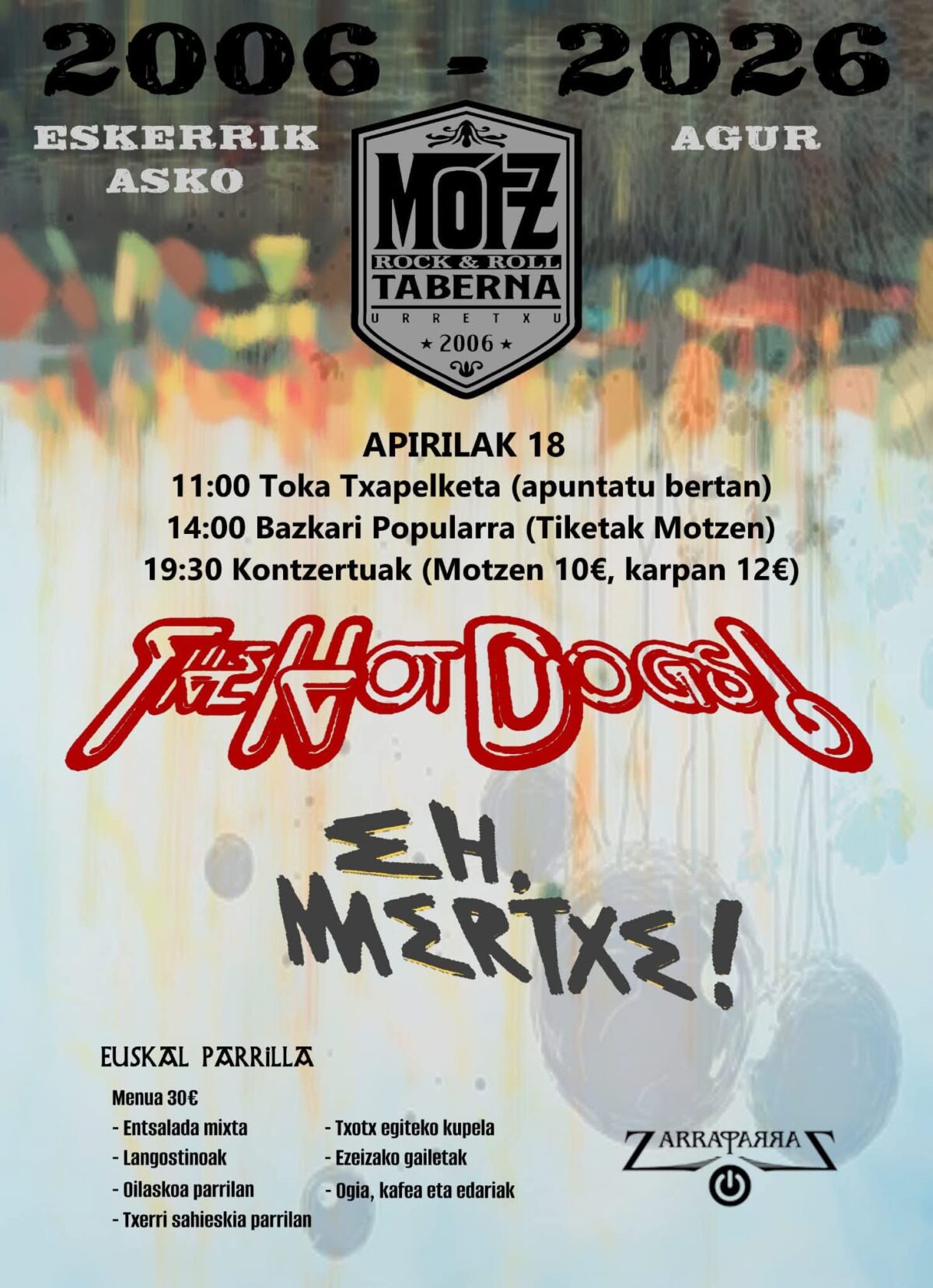 - 19:30. Kontzertuak: The Hot Dogs! eta EH, Mertxe!