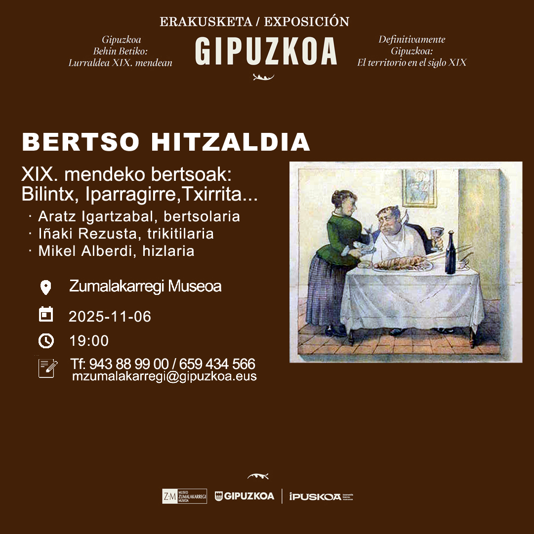 Igartzabal 'Gipuzkoa behin betiko: Lurraldea XIX. mendean' aldi baterako erakusketaren inaugurazio ekitaldianZumalakarregi Azaroaren 6an, 19:00etan, XIX. mendeko Gipuzkoa bertso-hitzaldia izango da Ormaiztegiko Zumalakarregi museoan. Aratz Igartzabal Bidegain Potto bertsolariak XIX. mendeko Gipuzkoari buruzko bertsoak abestuko ditu eta Mikel Alberdi Sagardia historialariak haien testuingurua emango du.