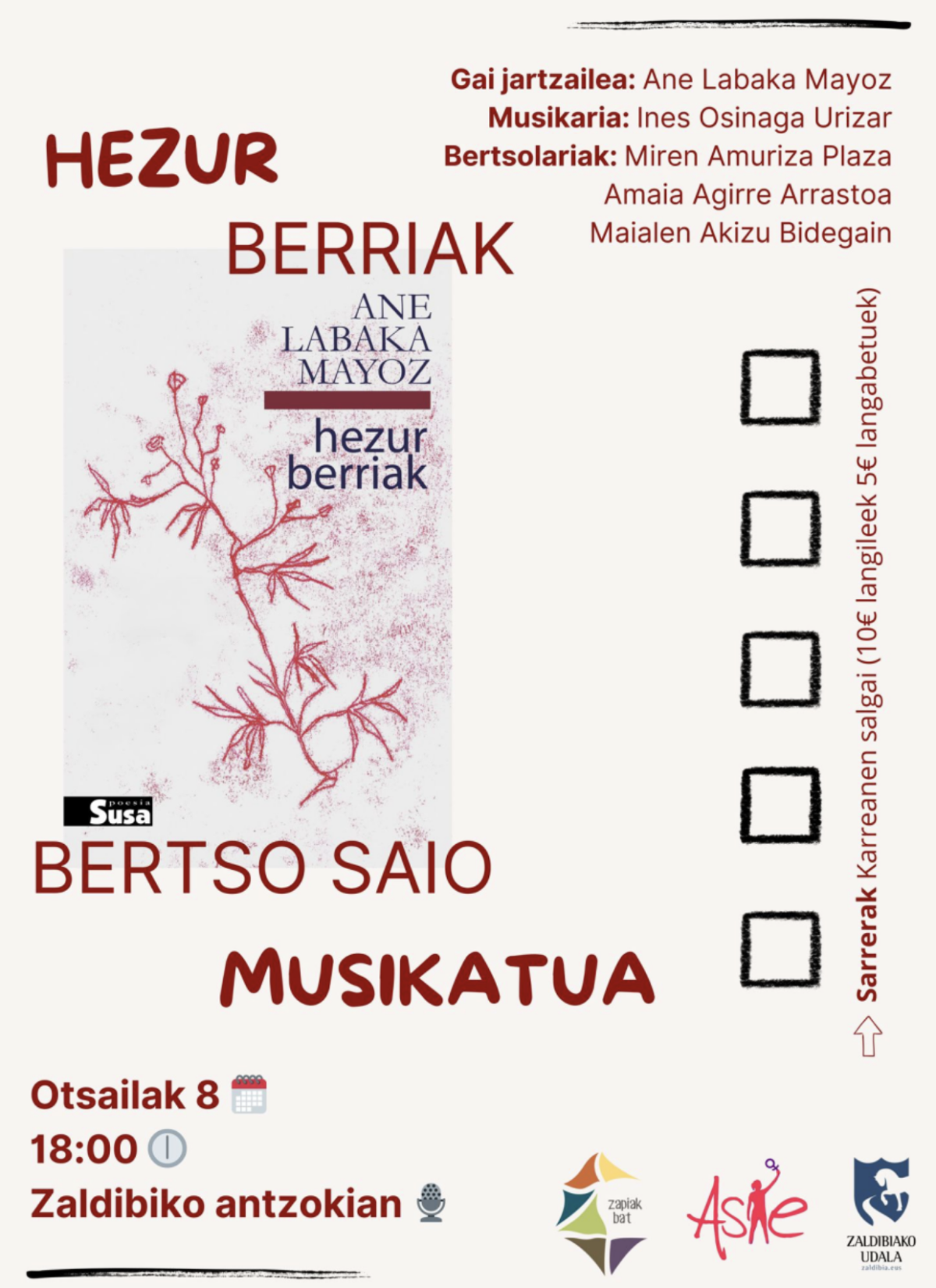 Otsailaren 8an, 18:00etan, Hezur berriak bertso saio musikatua izango da Zaldibiako Herri Antzokian. Gai-jartzailea: Ane Labaka Maioz. Musikaria: Ines Osinaga Urizar. Bertsolariak: Miren Amuriza Plaza, Amaia Agirre Arrastoa eta Maialen Akizu Bidegain.