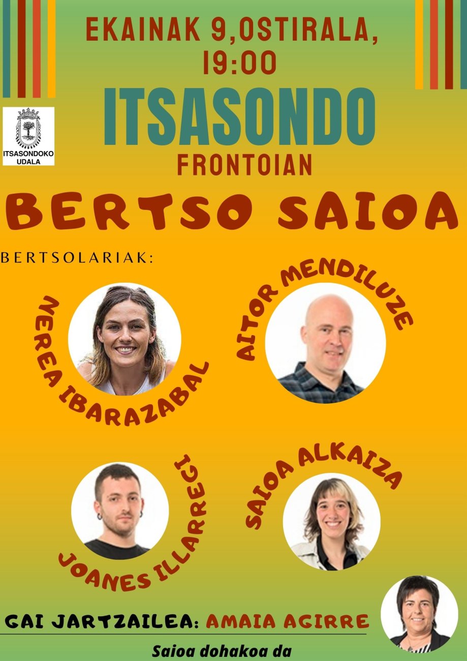 Ekainaren 9an, 19:00etan, bertso saioa izango da Itsasondoko frontoian Aitor Mendiluze, Nerea Ibartzabal, Saioa Alkaiza eta Joanes Illarregi bertsolariekin. Gai-jartzailea: Amaia Agirre