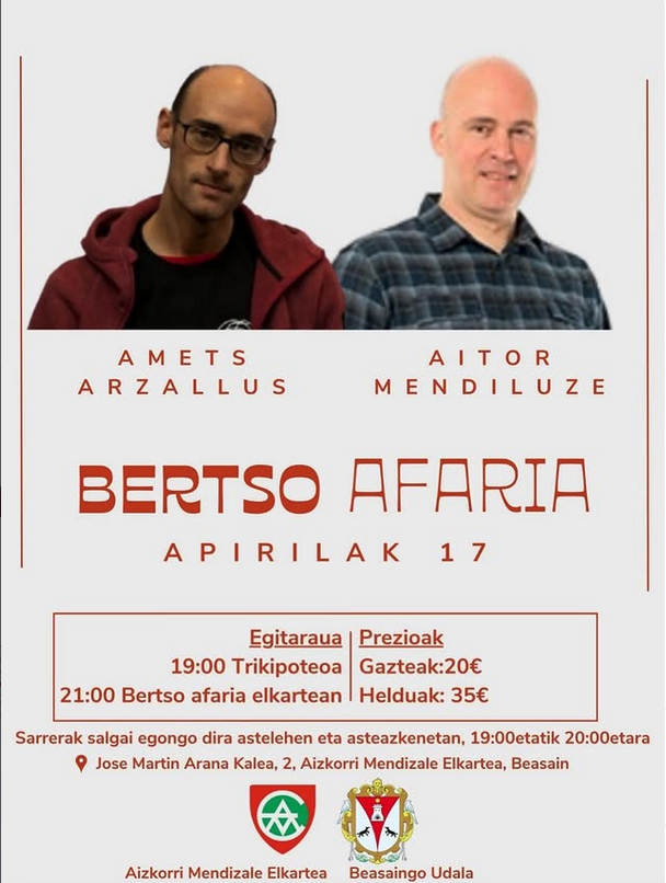 Apirilaren 17an bertso afaria egingo dute Beasaingo Aizkorri mendizale elkartean Amets Arzallus eta Aitor Mendiluzerekin.
