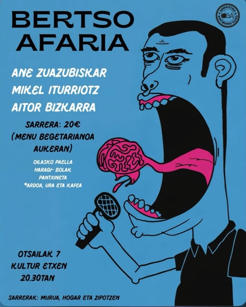 Otsailaren 7an, 20:30ean, bertso afaria egingo dute Ane Zuazubiskar, Mikel Iturriotz eta Aitor Bizkarra bertsolariekin Ormaiztegiko kultur etxean.