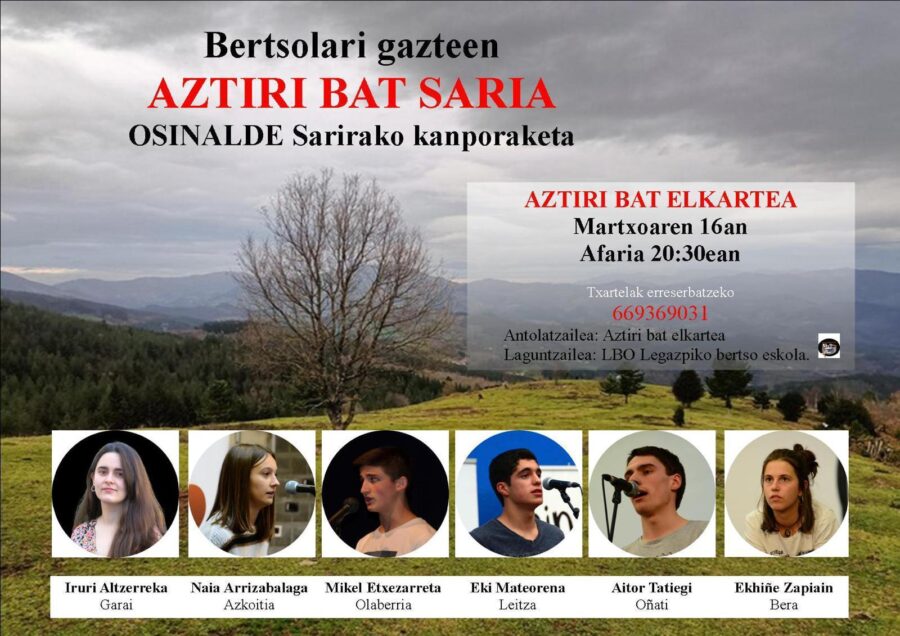 Bertsolariak: Aitor Tatiegi (Oñati, 2001), Ekhiñe Zapiain (Bera, 2002), Eki Mateorena (Leitza, 2005), Iruri Altzerreka (Garai, 2000), Naia Arrizabalaga (Azkoitia, 2004) eta Mikel Etxezarreta (Olaberria, 2003).